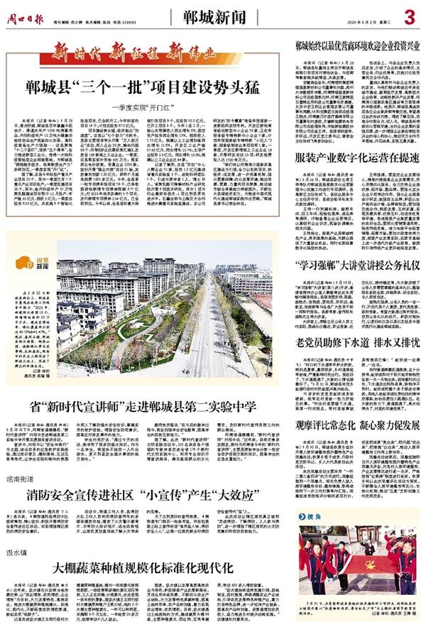 本报讯(记者 徐松) 3月26日,春光明媚,郸城县百年康鑫中药饮片、清道夫年产1000吨消毒用品、丹阳科技年产10万吨大健康功能性饮品生产现场如火如荼,高科技装备生产力强劲……该县聚焦“十二个紧盯”,狠抓“五个清单”,全力推进新型工业化,使得一大批科技智能型企业相继落地,为郸城县“拥抱数字技术、培育新质生产力”添砖加瓦,一季度实现“开门红”。