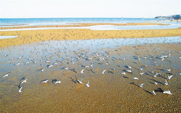 3月31日,一群水鸟在河北省秦皇岛市北戴河区沿海湿地飞舞(无人机照片)。 近日,大批迁徙候鸟飞抵河北省秦皇岛市北戴河区沿海湿地觅食、停留,出现万鸟临海场景。据介绍,北戴河沿海湿地鸟类食物丰富,每年有种类、数量众多的候鸟迁徙经过这里,还有数量可观的夏候鸟和留鸟在本地繁衍生息。新华社记者 杨世尧 摄
