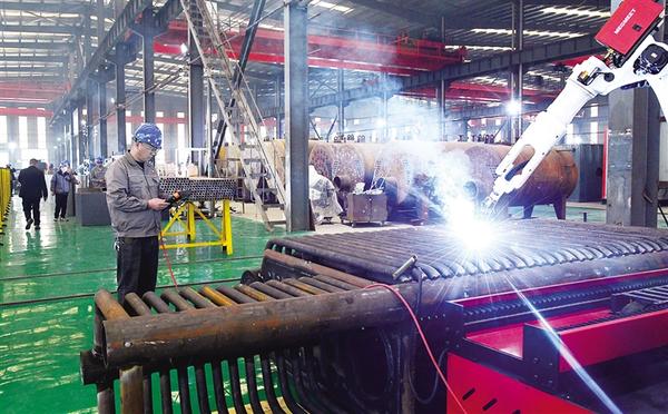 太康县锅炉产业孵化园项目总投资10亿元,主要入驻锅炉、压力容器等装备制造企业。目前,该园区已有11家公司入驻,年产值3亿元,利税2500万元。图为已入驻园区的企业车间内,技术人员正在操控机器人进行焊接工作。记者 王映 摄