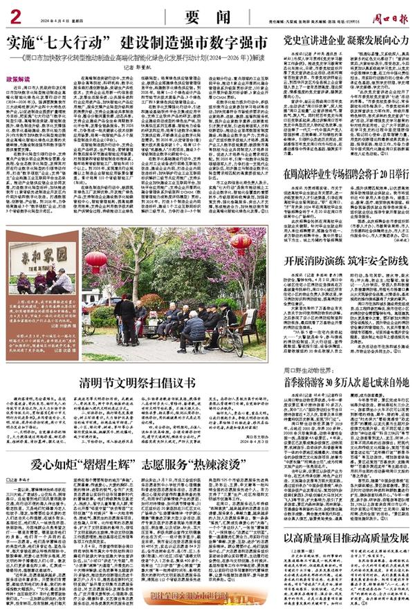 近日,周口市人民政府印发《周口市加快数字化转型推动制造业高端化智能化绿色化发展行动计划(2024—2026年)》,强调要聚集我市三大战略性新兴产业和十大特色优势产业,以促进制造业提质扩量增效为目标,把实施“七大行动”(数字化转型引领、高端制造突破、智能制造提升、绿色制造升级、数字化支撑强化、数字化基础建设、数字化能力提升)作为我市加快数字化转型推动制造业高端化智能化绿色化发展的关键举措,为建设制造强市和数字强市提供重要支撑。