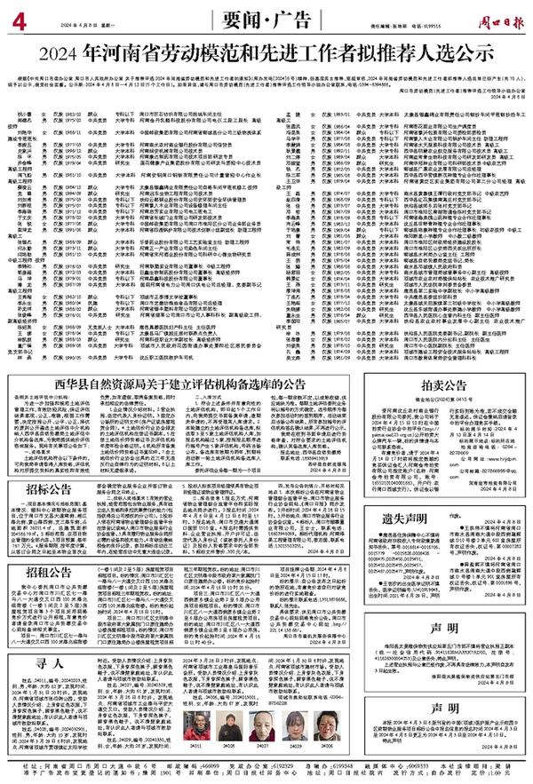 根据《中共周口市委办公室 周口市人民政府办公室 关于推荐评选2024年河南省劳动模范和先进工作者的通知》(周办发电〔2024〕6号)精神,经基层民主推荐、逐级审核,2024年河南省劳动模范和先进工作者拟推荐人选名单已经产生(共70人),现予以公示,接受社会监督。公示期:2024年4月8日—4月12日(5个工作日)。如有异议,请与周口市劳动模范(先进工作者)推荐评选工作领导小组办公室联系,电话:0394-8394868。