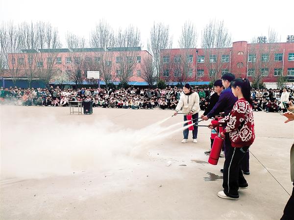 为切实做好校园消防安全工作、营造安全稳定的校园环境,近日,商水县练集镇团委、镇妇联、镇专职消防队到镇第一小学开展消防安全演练,向学生普及消防安全知识。图为演练现场。