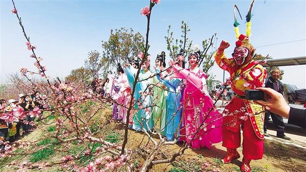 近日,西华县第二十届桃花赏游消费季活动精彩开幕,吸引众多游客前来观光旅游。图为河南越调剧团的演员与游客互动。 记者 张猛 孙靖 摄