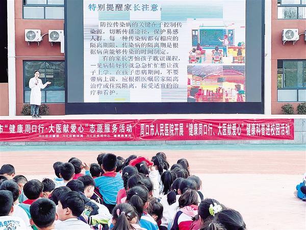 为让校园师生更好地了解春季传染病预防知识,提高健康素养,4月9日,周口市人民医院科普专家走进周口市建设路实验学校,开展春季传染病预防知识讲座。图为科普专家正在为师生授课。 张欢欢 摄