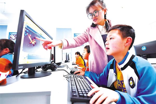 4月11日,在湘潭市雨湖区九华和平科大小学,老师(右二)在趣味编程课上指导学生。