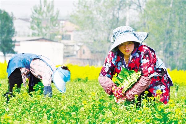 4月11日上午,菜农们在西华县东王营乡的源盛丰农业家庭农场采摘成熟的苔菜。该家庭农场面积400亩,是一个有机蔬菜种植基地,生产的苔菜主要供应广州、深圳、香港等地。记者 梁照曾 摄
