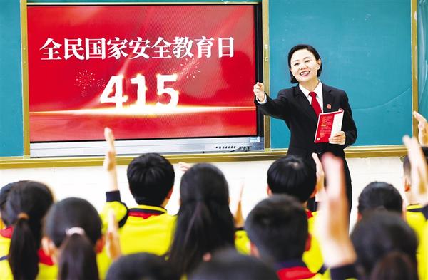 4月12日,山东省枣庄市市中区人民法院法官在东湖小学给学生们讲解国家安全相关法律法规知识。全民国家安全教育日临近,各地学校通过多种方式向学生普及国家安全相关法律法规知识,增强学生们对总体国家安全观的认识,共筑国家安全防线。新华社发(孙中喆 摄)