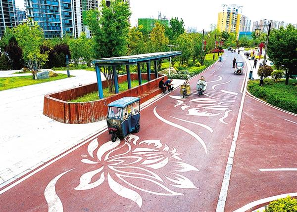 4月22日,市民脚踏“莲花”行走在滨河公园河北段彩色防滑路面上。作为市民休闲的场所,彩色防滑路面耐磨性和抗老化能力突出,具有美化环境、防滑降噪、路标指引等特点。