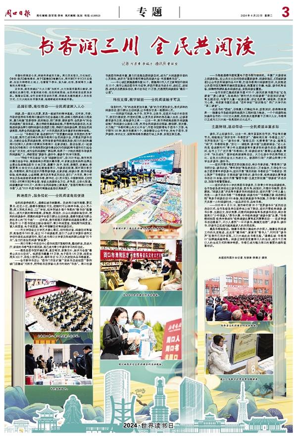 ——以“书香润万家 奋进新时代”“有质量的阅读 有深度的思考”为主题,我市已成功举办两届书香周口全民阅读大会,开展系列读书活动,点燃社会各界阅读热情,受到省委宣传部通报表扬;倾力打造《典籍周口》《周口人讲周口故事》《书香周口·名家讲座》,轰动全国;《一起读报告》《书香周口·好书周周荐》《读书漫谈》《为你朗读》等专题专栏引起全社会广泛关注,成为全民阅读推广新品牌,培养了一大批优秀图书导读员和阅读推广人,持续营造“爱读书、读好书、善读书”的学习氛围。