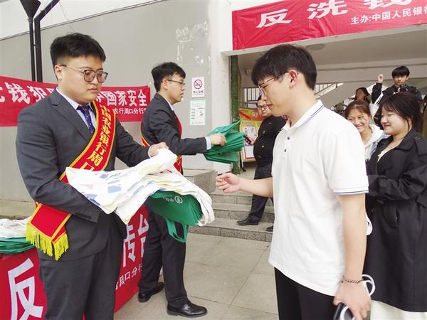 近日,由中国人民银行周口市分行主办,周口市国家安全局、周口职业技术学院、农行周口分行承办的周口市第三期“反洗钱知识大讲堂”在周口职业技术学院成功举办。图为农行周口分行工作人员向大学生发放宣传资料。 郭振华 程飞帆 摄