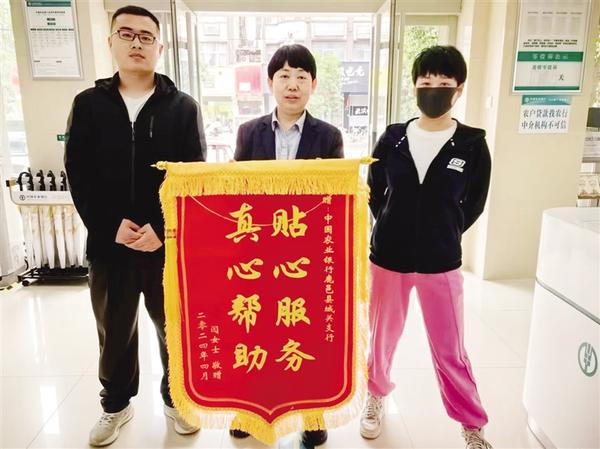 今年以来,农行周口分行积极推进“网点服务升温工程”,培育有温度、有情怀、有担当的网点服务文化和金融服务精神,赢得客户广泛好评。图为近日,农行鹿邑城关支行收到客户送来的写有“贴心服务 真心帮助”字样的锦旗。石艳青 宋元元 摄