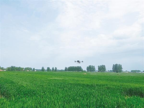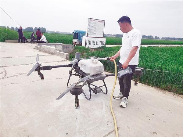 近期,沈丘县100余万亩小麦迎来抽穗扬花期。为加强田间管理,有效预防小麦赤霉病、红蜘蛛等病虫害发生,该县及时组织无人机为小麦喷施杀菌剂、杀虫剂、叶面肥等,为确保今年小麦丰收奠定基础。上图为工作人员为无人机添加农药。右图为无人机为老城镇6万余亩小麦喷洒农药。