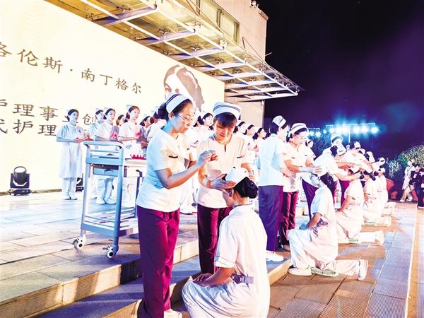 为迎接5月12日国际护士节的到来,5月9日,周口职业技术学院护理学院举行护士节授帽传烛仪式。图为授帽仪式上,护理教师代表为即将踏入实习岗位的学生授帽。记者 刘华志 摄