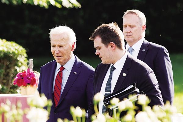这是5月13日在美国华盛顿白宫拍摄的美国总统拜登(左一)。美国总统拜登13日签署一项法案,禁止美国进口俄罗斯生产的低浓缩铀。