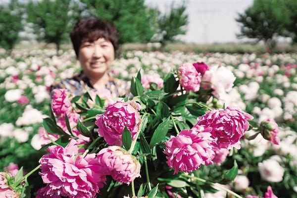 5月15日,游客在河北省柏乡县内步乡马村芍药种植基地内展示采收的芍药。