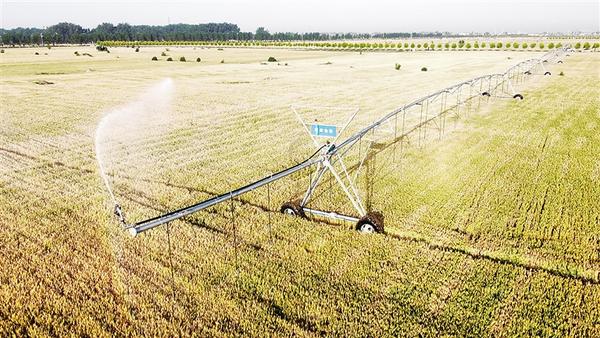 丰收的时刻即将到来,麦田里的小麦在风的吹拂下如波浪般翻滚。图为5月16日,在淮阳区高标准农田里,平移式喷灌设备正在灌溉,农民正在除草。