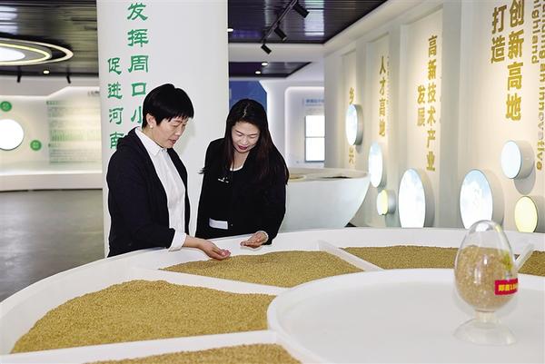 5月17日,记者在河南周口国家农业高新技术产业示范区展示大厅看到,两个“中国碗”造型的大粮仓满满装着小麦、玉米、大豆、绿豆等粮食,寓意“中国碗”装满“中国粮”。近年来,河南周口国家农业高新技术产业示范区先后落地实施国家小麦玉米现代农业产业园等6个国家级项目,实现高标准农田全覆盖,累计繁育推广小麦新品种31个,完成小麦优良品种种植10万亩。记者 徐松 摄