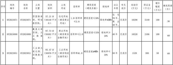 拍卖报价时间:HY2023071地块: 2024年 6月14日9时;HY2024008地块: 2024年6月14日9时10分;HY2023051地块: 2024年6月14日9时20分。