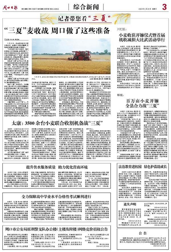 小麦收割忙,电力有保障。国网周口供电公司对农田内线路、杆塔、台区进行全面“体检”,重点对全市11626个低压农排台区、108207眼机井电力设施仔细排查,保证设备健康运行和电力安全畅通。组织人员深入田间地头了解群众用电情况,及时受理业务,实行低压用电“随需随办、随办随用”,对突发异常电路设施实施“二十分钟”到位处突机制。发挥农村供电服务网格和“村网共建”作用,动态掌握群众用电事项,以优质服务、可靠电能助力夏粮丰收。