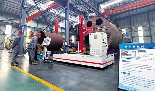 目前,太康县全球共享锅炉制造产业园企业在生产工艺上已完成了由传统制造到智能制造的转变,生产效率比以往提高60%,生产成本下降20%。图为企业生产车间里,技术工人在操作智能化生产设备进行焊接。