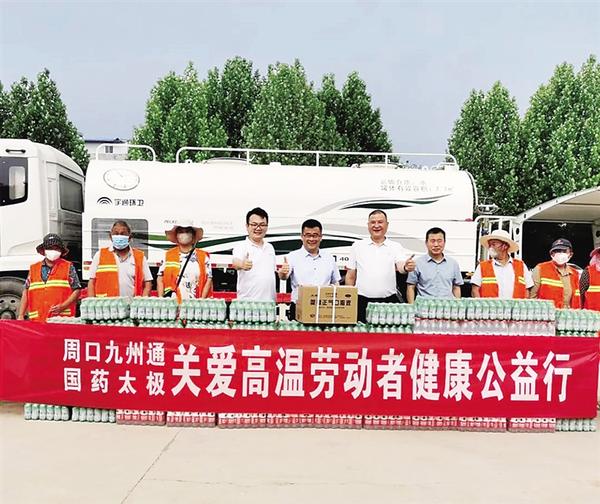 5月22日,临港开发区公用事业管理中心联合辖区爱心企业周口九州通医药有限公司,开展“关爱高温劳动者健康公益行”活动,为环卫工人送上爱心物资,衷心感谢他们的辛勤付出。记者 宋风 摄