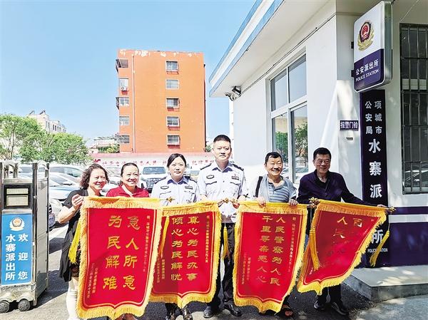 近日,从云南昆明跨越千里来项城寻亲的曹建华兄妹4人,在水寨派出所民警的帮助下如愿找到亲人,临走时特送上4面锦旗以示谢意。图为曹建华兄妹4人与民警合影留念。记者 张志新 通讯员 牛天慧 摄