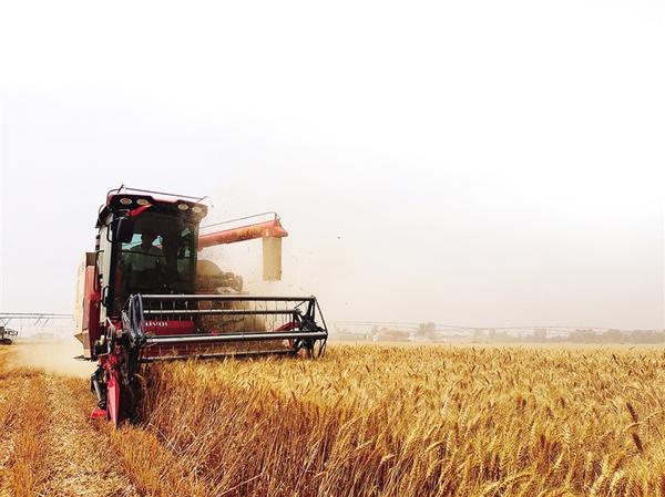 6月1日,位于扶沟县大新镇杨庄村的扶沟县高标准农田,收割机正在收割小麦,田间地头一派忙碌景象。记者 金月全 摄