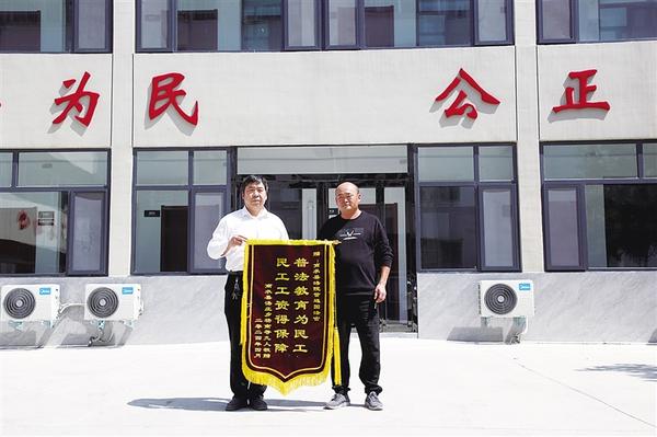 近年来,县人民法院城关法庭不断探索创新调解工作新机制、新方法, 全力以赴做好调解工作,调解率逐年稳步上升。图为农民工代表近日为县人民法院城关法庭庭长訾连国(左一)送上一面印有“普法教育为民工 民工工资得保障”字样的锦旗。记者 马治卫 通讯员 陈艳芳 摄
