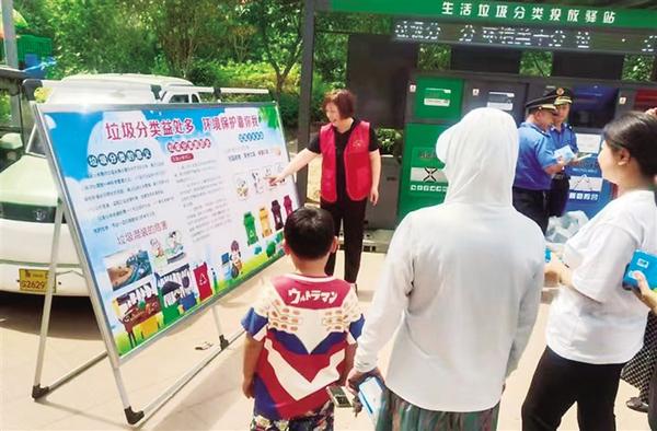 为持续推进生活垃圾分类工作、进一步提高群众参与生活垃圾分类的自觉性,川汇区大力组织开展生活垃圾分类主题宣传进社区活动。图为6月1日,区城管局工作人员在人和街街道新民社区向群众讲解生活垃圾分类知识。 记者 韩志刚 摄