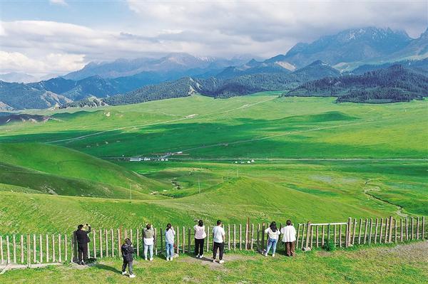 这是6月5日在新疆塔城地区沙湾市拍摄的鹿角湾景区风光(无人机照片)。进入六月,位于新疆塔城地区沙湾市的鹿角湾景区迎来了最美时节。遥望冰封雪岭,近看碧草繁花,天高地阔的美丽风光,令人仿佛置身童话世界。新华社记者 丁磊 摄