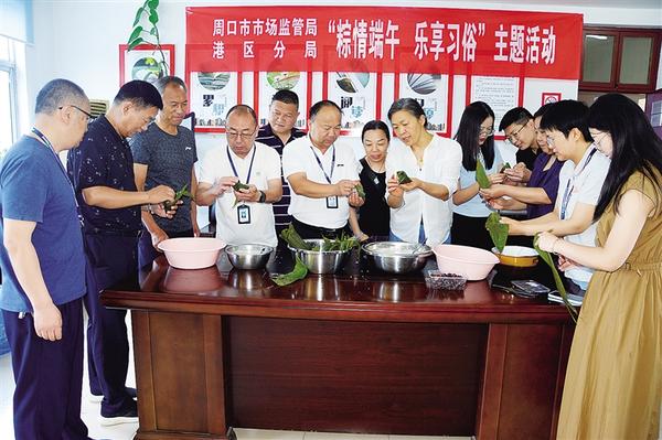 6月5日上午,市市场监管局港区分局开展“粽情端午 乐享习俗”主题活动。活动现场,该分局全体干部围着方桌,热情满满,粽叶、糯米、红枣在大家的手中翻转飞舞,变成一个个美味的粽子。此次活动,传承弘扬了传统佳节文化习俗,营造了浓厚的机关文化氛围。王燕 摄