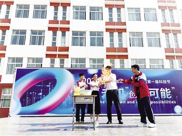 5月31日,郸城县第二实验中学举行第一届科技节。图为师生现场做气体燃烧类实验。记者 徐松 通讯员 鲁迅彬 摄