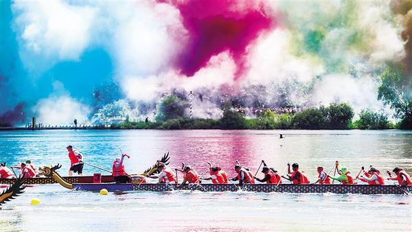 6月10日,在吉林省吉林市举行的2024年端午节国际龙舟邀请赛上,参赛队伍在松花江上竞逐(无人机照片)。 当日是传统节日端午节,各地举办龙舟比赛和巡游活动。 新华社记者 颜麟蕴 摄