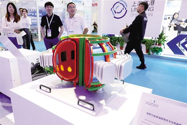 6月12日在展览现场展出的洪荒70全高温超导托卡马克装置模型。