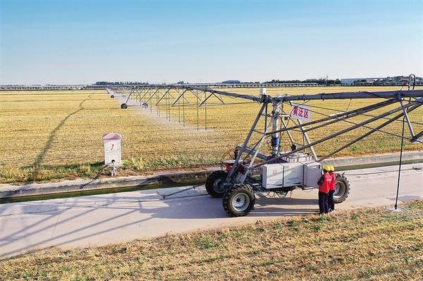 当前,黄泛区农场已实现农田机井通电全覆盖。时值大旱,黄泛区农场十余万亩玉米苗已普浇两遍水。图为6月13日,国网周口供电公司共产党员服务队队员正在农场田间检查用电设备,为抗旱保苗提供“满格电”。