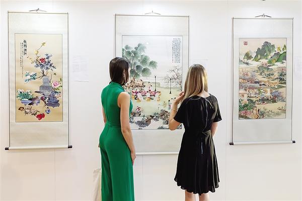6月13日,在匈牙利布达佩斯,人们在2024年布达佩斯中国旅游文化周暨首届中国非遗旅游文创展开幕式后参观展览。