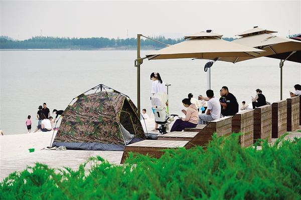 6月14日,位于市城乡一体化示范区的引黄调蓄工程白沙滩聚集了一些前来避暑游玩的市民。宽阔的水域、翱翔的鸟群相映衬,一幅优美的生态画卷在游客面前徐徐展开。引黄调蓄工程集灌溉调蓄、区域排涝、水质保持、亲水生态为一体,有力促进了我市节水型社会和生态城市建设。记者 沈湛 摄