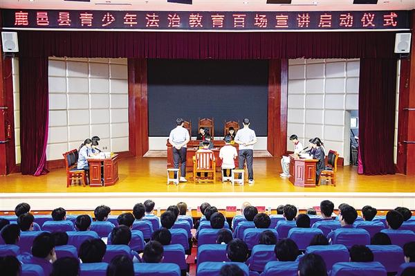 6月18日,鹿邑县青少年法治教育百场宣讲活动启动仪式在县高级中学报告厅举行。活动中,县司法局负责人宣读了《关于聘任30名鹿邑县青少年法治宣讲员的决定》。随后,在场人员共同观看庭审情景剧,了解案件审判过程。 记者 侯国防 通讯员 郭恒禹 摄