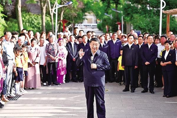 傍晚时分,社区广场十分热闹,居民们看见总书记来了,纷纷围拢过来,热烈鼓掌欢迎。习近平亲切地对大家说,时隔4年,我再次来宁夏看望各族干部群众,见到大家非常高兴!中华民族是一个大家庭,各族人民要像石榴籽一样紧紧抱在一起。要不断铸牢中华民族共同体意识,把各族人民的心紧紧连在一起,把各方面的力量广泛凝聚到一起,共同推进中国式现代化,共襄中华民族伟大复兴的盛举。