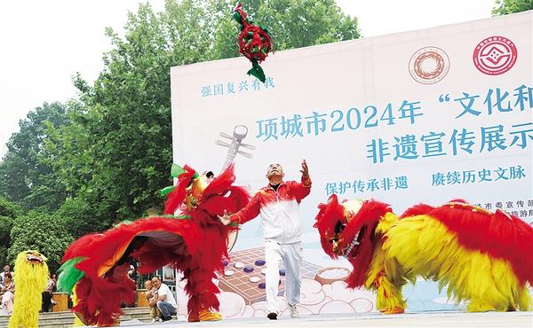 日前,项城市举办2024年“文化和自然遗产日”非遗宣传展示活动,让非遗文化“活”起来、“火”起来。图为舞狮表演。