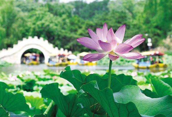 6月28日,游客在圆明园坐游船欣赏荷花。 当日,北京圆明园第二十九届荷花节开幕,本届荷花节以“荷为诗意”为主题,通过“荷为诗意”展、“莲结诗意”戏剧展演两大活动,为市民游客打造一场诗歌、戏剧与荷花美景相结合的美学盛宴。荷花节活动将持续至8月31日。新华社记者 罗晓光 摄