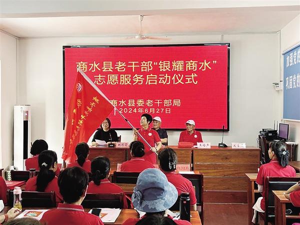 近日,商水县老干部“银耀商水”志愿服务启动仪式在商水县老干部大学举行。据悉,“银耀商水”志愿服务总队下设理论宣讲银发志愿服务队等10支分队,旨在号召队员发挥政治优势、经验优势、专业特长,为现代化商水多做贡献。图为授旗仪式现场。记者 马治卫 通讯员 孙俊生 摄