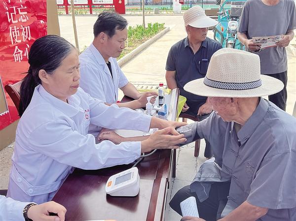 7月5日,周口市人民医院医联体组织医疗专家走进川汇区城北街道邵火庙行政村,开展健康科普进乡村义诊活动,引导群众不断增强自我保健意识和健康管理能力。图为义诊现场。史书杰 摄