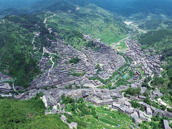 这是7月9日拍摄的西江千户苗寨全景(无人机照片)。当日,位于贵州省雷山县的世界最大苗寨——西江千户苗寨迎来暑期旅游高峰,据景区统计,当日接待游客人数已达23500余人次。 新华社记者 刘续 摄