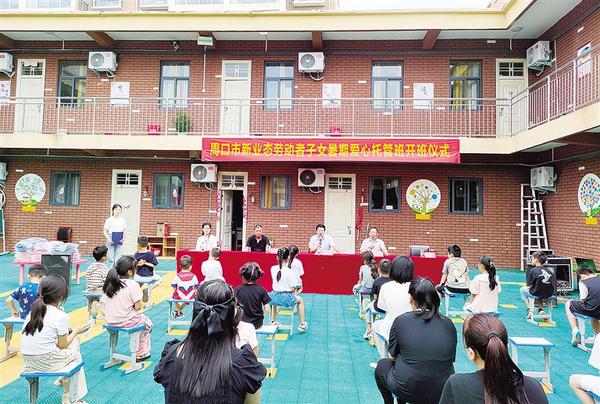 7月10日上午,周口市新业态劳动者子女暑期爱心托管班开班仪式举行。暑假期间,新业态劳动者“带娃”难题愈发突出。为解决这一难题,周口市总工会提前谋划,开办了专门针对新业态劳动者子女的爱心托管班,为广大快递员、外卖员、网约车司机和大货车司机等群体解决暑假期间孩子无人看管的难题。记者 王晨 摄
