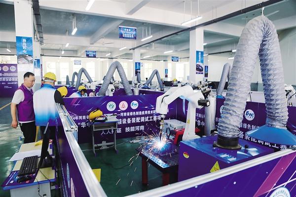 在参赛选手操控下,伴随着“嘶嘶”的声音,比赛现场焊花四射、火光交错。7月12日,2024年河南省绿色制造应用技术职业技能大赛焊接设备装配调试工赛项实操比赛在周口职业技术学院举行。大赛旨在持续推进全民技能振兴工程和高技能人才振兴计划实施,着力培养绿色低碳、生态环保等重点领域人才,发展壮大节能环保装备产业链人才支撑。记者 刘华志 摄