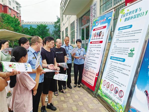 为全面贯彻落实习近平生态文明思想,加快推进生活垃圾分类,有效开展生活垃圾源头减量工作,7月12日上午,周口市市场监管局港区分局在李埠口街道未来社区开展一次性塑料制品治理宣传活动。图为活动现场。王燕 摄