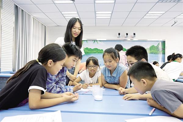 7月11日,复旦大学的志愿者带领孩子们做浮力实验。