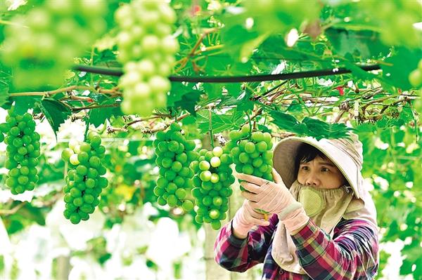 7月12日,在广西柳州市鹿寨县鹿寨镇角塘村,村民采摘葡萄。