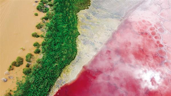巴丹吉林沙漠中的红海子(2022年7月13日摄,无人机照片)。当地时间7月26日,在印度新德里举行的第46届联合国教科文组织世界遗产委员会会议上,我国申报的巴丹吉林沙漠—沙山湖泊群顺利通过评审,成功列入《世界遗产名录》。新华社记者 贝赫 摄